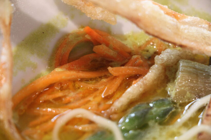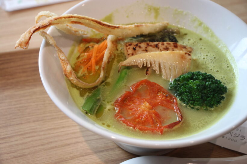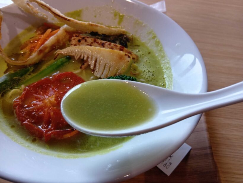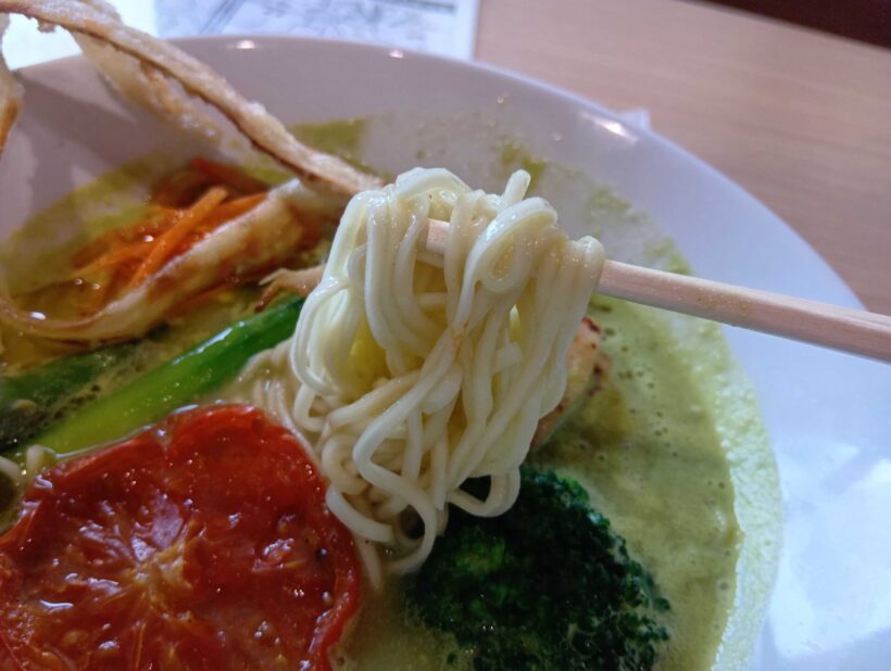 まずはスープから。いわゆる「ベジポタ系ラーメン」とは、野菜スープとベースに鶏ガラや豚骨・魚介のスープを合わせたものが定番とされるが、ここのは動物系を使っていないという。この緑はグリーンピースらしく、様々な野菜から抽出されたスープと豆乳を合わせているという。どれ。