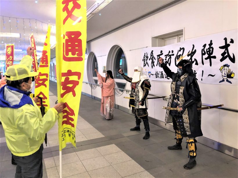 新潟県の上越警察署などが「越後上越上杉おもてなし武将隊」とともに飲食店を訪問、飲酒運転防止を呼び掛け
