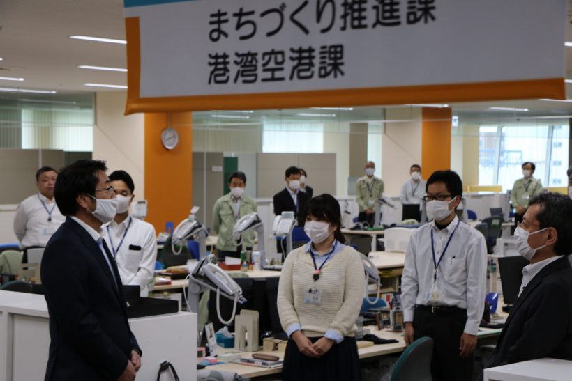 職員を前に挨拶した中原八一市長は、「いよいよ今日からふるまち庁舎がオープンする。質の高い行政サービス、街中の賑わい創出の両立というものが市民の皆さんから期待されている。この点に十分配慮していただきたい」などと話していた。