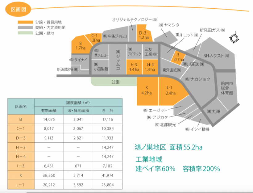 一方、新潟中条中核工業団地(鴻ノ巣地区)は新潟県胎内市清水地内にある。分譲可能面積と区画数は10.4ha(6区画=0.7〜4.2ha)。分譲価格は9,890/平方メートルから6,923円/平方メートルに引き下げる。