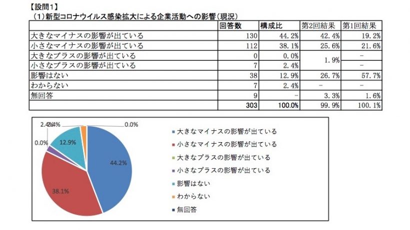 「新型コロナウイルス感染症拡大による企業活動の影響について」に対しては、「大きなマイナス影響」が44.2%、「小さなマイナス影響」が38.1%と、合計で8割以上の企業が「影響が出ている」と回答した。5月27日から6月4日に実施された第2回調査の約7割から増加という結果になった。前回調査と比較した場合、「小さなマイナス影響」が約1.5倍に増加しており、これは、前回「今後に影響が出る」と回答した23.0%の企業がシフトしたものだと考えられる。