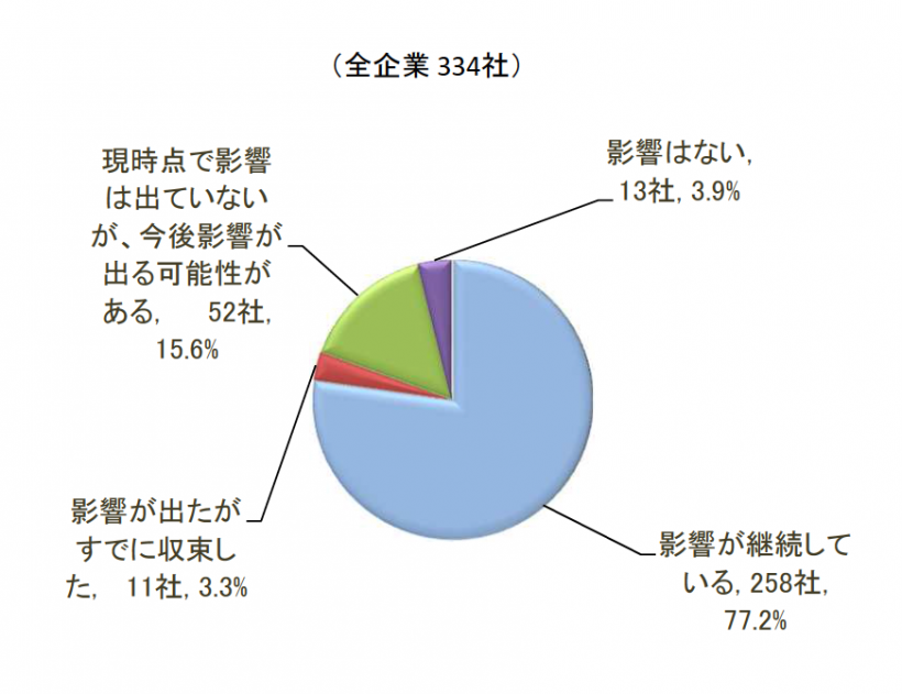 「新型コロナウイルスの感染拡大は、企業活動に影響を及ぼしていますか?(択一回答)」という問いについては、「影響が継続している」が77.2%(258社)で最多だった。以下、「現時点で影響は出ていないが、今後影響が出る可能性がある」が15.6%(52社)、「影響はない」は3.9%(13社)、「影響が出たがすでに収束した」は3.3%(11社)だった。