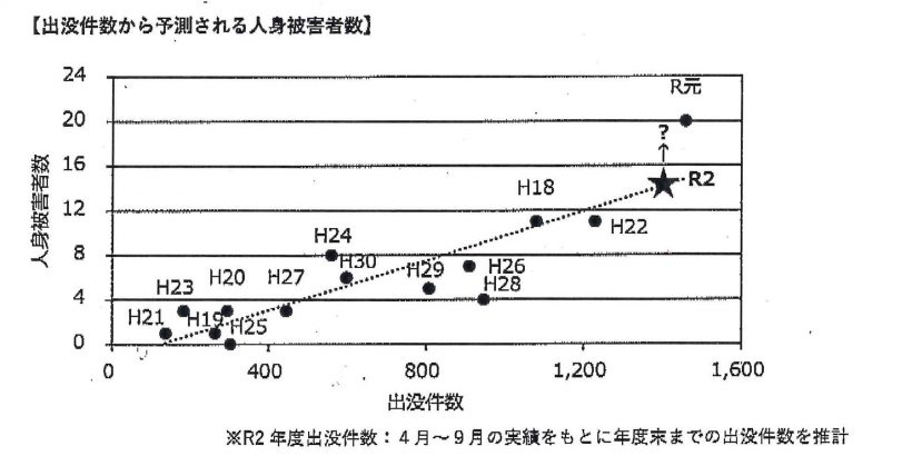 出没件数から予想される人身被害者数は10人以上になっている(下の表参照)。