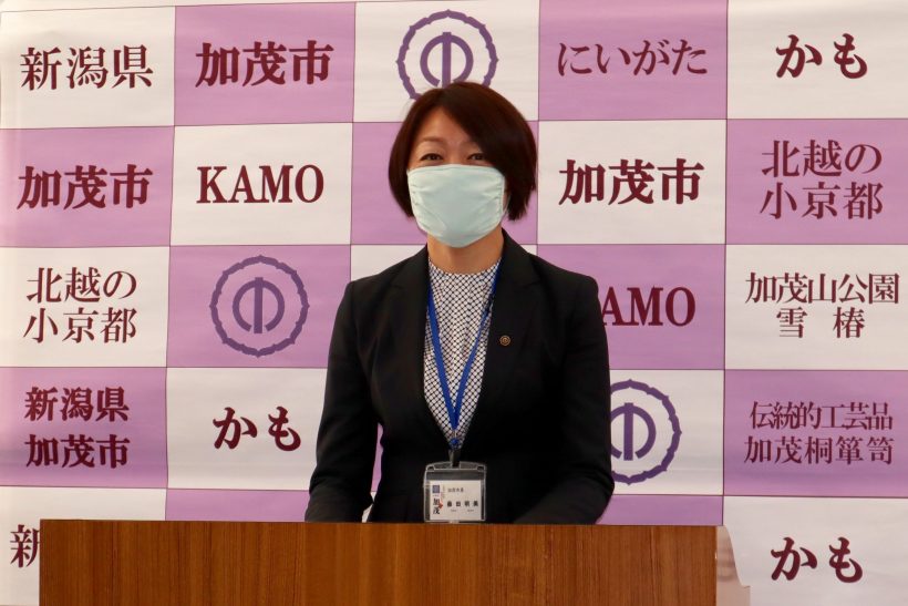 新潟県加茂市の藤田明美市長が定例会見にて、市内への災害情報や市政に関する情報発信サービス提供開始を発表(2020年11月4日)