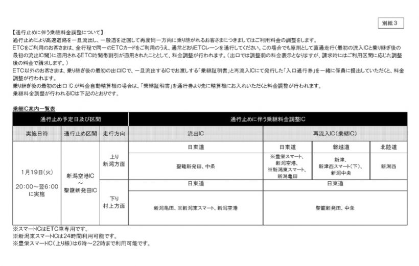 また、通行止めに伴う乗継料金の調整については、通行止めにより高速道路を一旦流出し、一般道を迂回して再度同一方向に乗り継ぐ場合に利用料金の調整を行うという。