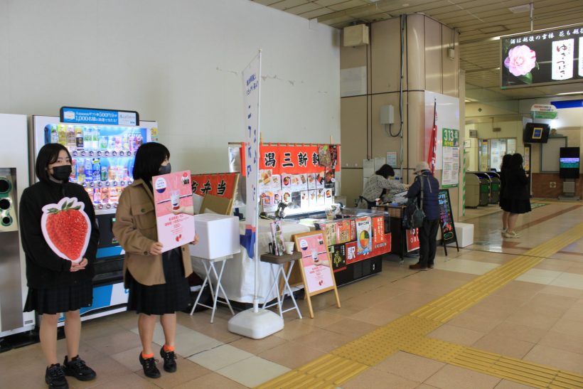 新潟市南区と新潟県立白根高等学校(新潟市南区)は13日、白根高校生が発案した「新潟県産いちご『越後姫』の初恋スムージー」を、白根高校生が新潟駅構内で販売・PRを行った。