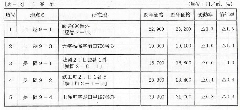 市町村別の平均変動率は、標準地のある25市町村農地、新潟市で上昇幅が横ばいとなったほか、3市で下落幅が縮小、7市町村で前年同率、14市町で下落幅が拡大した。
