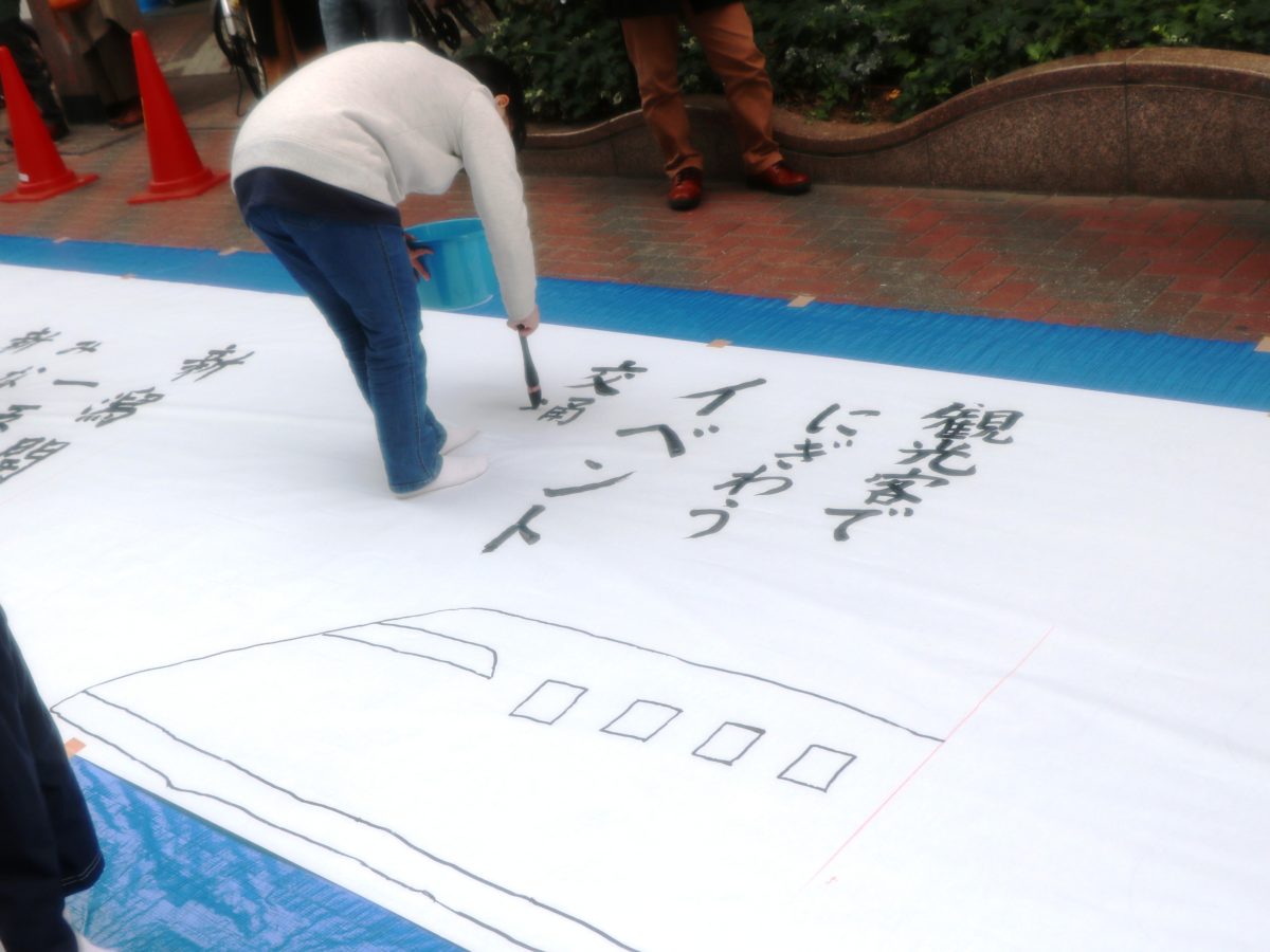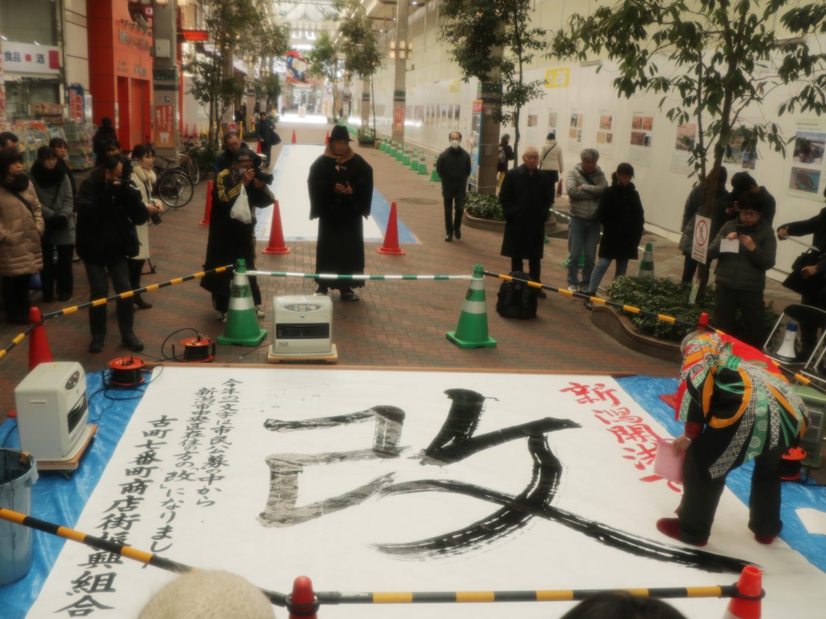 同時代館顧問の磯島瑛俊氏による「大字一文字揮毫」のほか、市内の書道教室に通う人々による「路上書初め」が行われた。このほか、大阪屋に提供による「おしるこ」の振る舞いもあった。