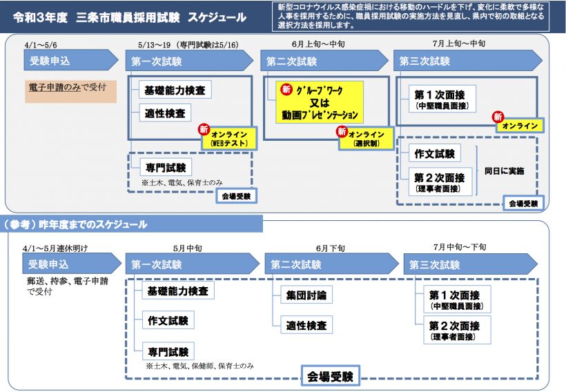 三条市では5月6日まで職員の募集を行っている(前期試験)の全3次までの試験の内、多くの過程をオンラインに変更した。