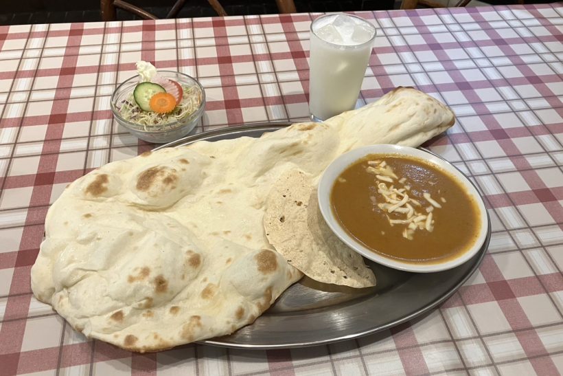 チキンとチーズの組み合わせがマズい訳ない。味の掛け算が発動することは間違いないだろう。辛さは中辛で注文。しばし待つと、大きなバケットに入ったナン、サラダ、プレーンラッシー、日替わりカレーのセットが運ばれてきた。