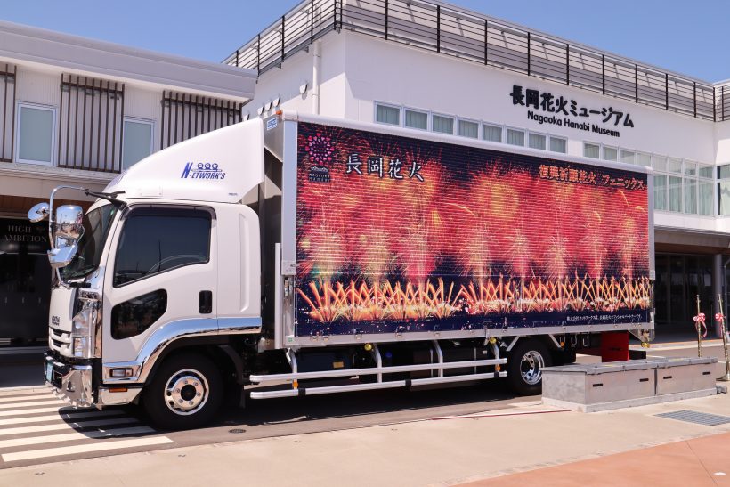 ネットワークス株式会社(新潟県長岡市)は長岡花火の写真をプリントしたトラック2台を製作し、22日にはその除幕式を道の駅「ながおか花火館」で開いた。同社の荒木正徳代表取締役社長が「『長岡花火は無くならない』ことを伝えるために製作した」と語るトラックは、23日から関東・関西方面を主として全国各地を巡る。