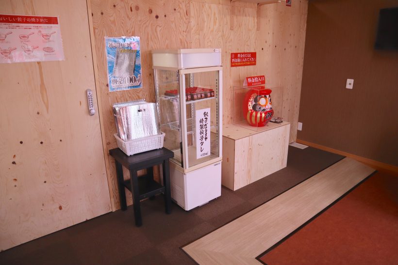 「餃子もだるまや」では、同社のラーメン店で提供されている餃子を冷凍餃子として販売。冷凍餃子の価格は、30粒(個)入りの1袋が1,000円。24時間営業であるが、定期的に職員が商品を補充しに訪れる際以外は無人であり、来店者は各自棚から餃子を取り、だるま型の容器に料金を投入して購入するシステムだ。