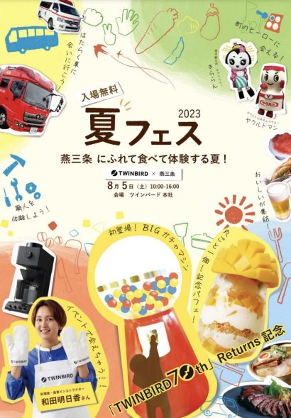 株式会社ツインバード(新潟県燕市)は8月5日、本社を会場にキッチンカーやワークショップの出店をはじめ多数のイベントを行う「TWINBIRD×燕三条夏フェス2023」を開催する。入場は無料。感染症禍の影響から4年ぶりの開催で、2021年の創業70周年以降は初。同社の家電を組み立てるものづくり体験も開催し、こちらの参加申込は7月23日までとなっている。