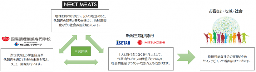 株式会社新潟三越伊勢丹(新潟市中央区)がネクストミーツ株式会社(東京都)、国際調理製菓専門学校(新潟市中央区)と連携し、代替肉メニューを提供