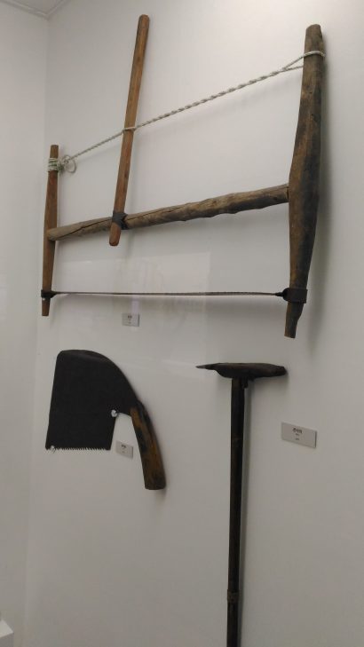 それは、製材のために考案された高麗時代(10~14世紀)の大きなノコギリ「オガ」です(写真上)。隣の陳列ケースには、浜辺で作業する船大工を模したジオラマがあり、そこでオガをつかう職人の姿がありました(写真下)。オガには2人で使うオガと、1人で挽くオガ(前挽きオガ)があります。そのうち、後者は押さず引くだけなので、日本で考案されたとの説がありました。しかし、その定説は私の眼前で修正を迫られるかもしれないこととなったのです。